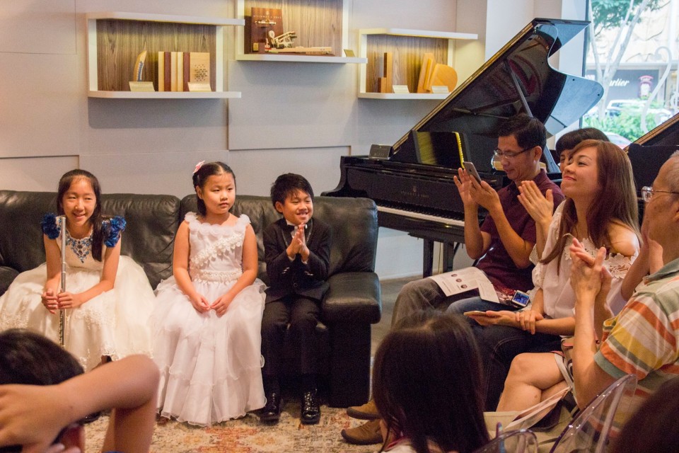 Launch of new Steinway Crown Jewel, Crowd listening to the trio, Yi Ting, Toby Tan, and Chen Jing
