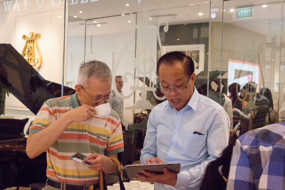 Pianovers Meetup #10, May Ling showing ThePiano.SG Polo Tee to some Pianovers