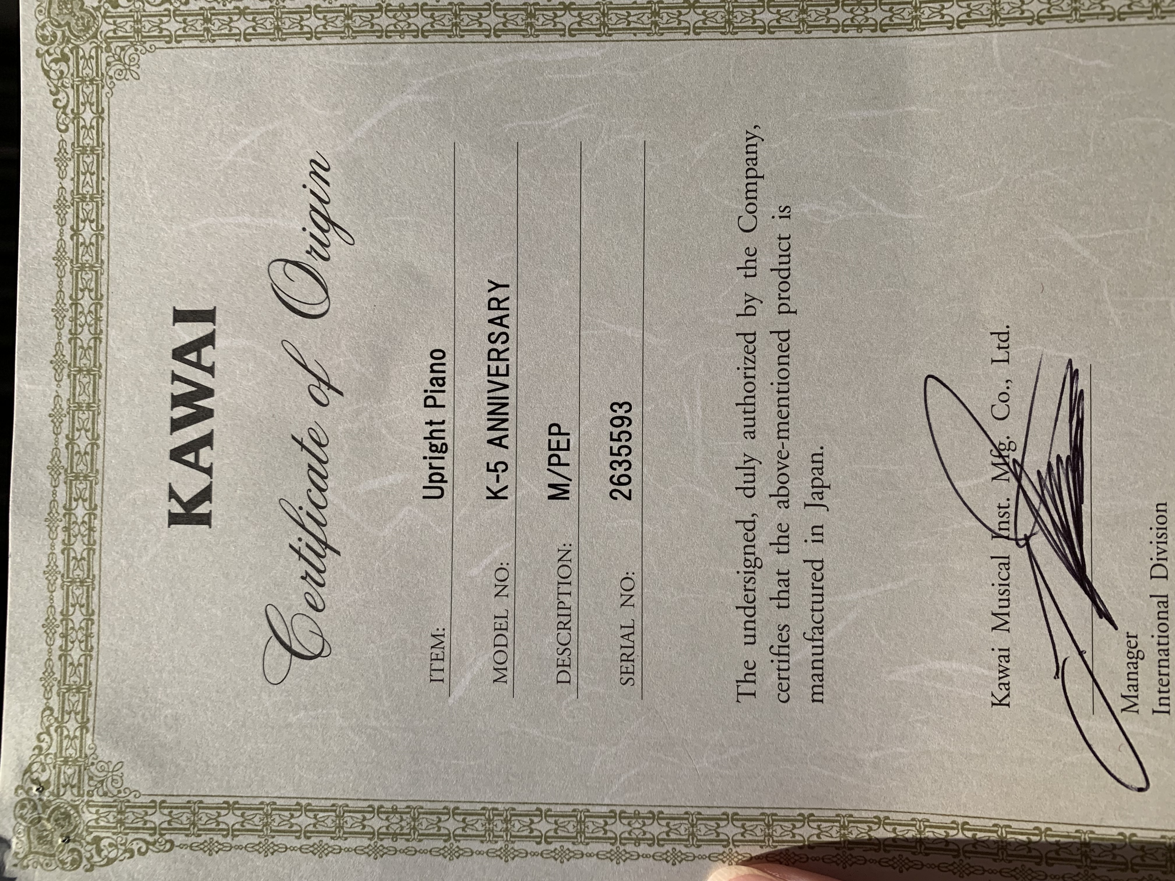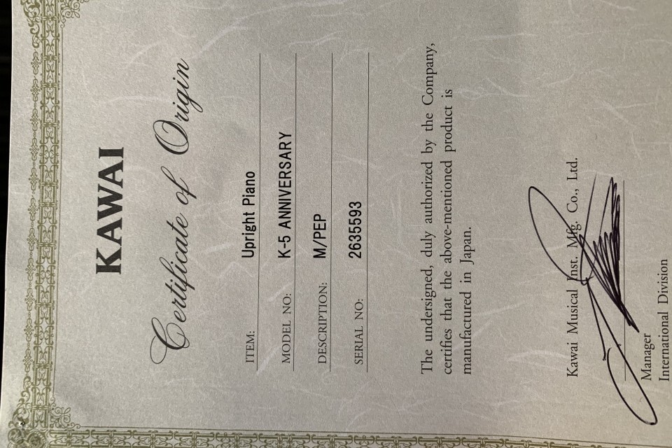 Made in Japan. Bought brand new in Nov 2011 from Robert Piano with purchase receipt.